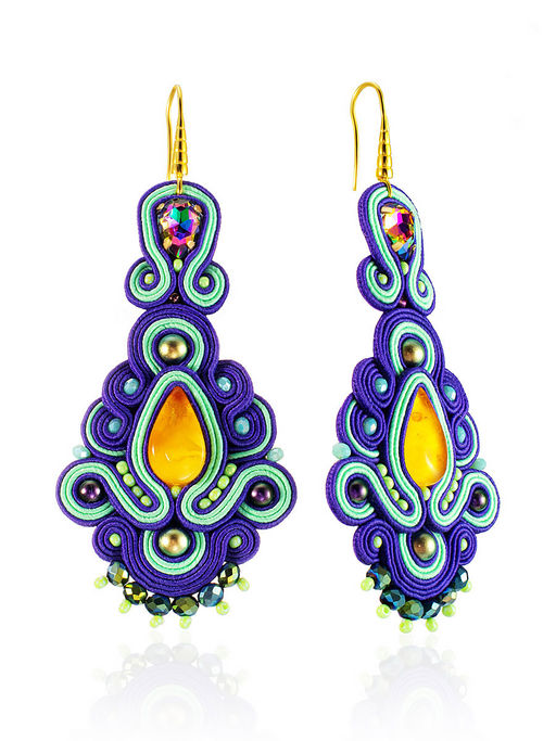 Яркие серьги ручной работы с натуральным янтарём и кристаллами Индия