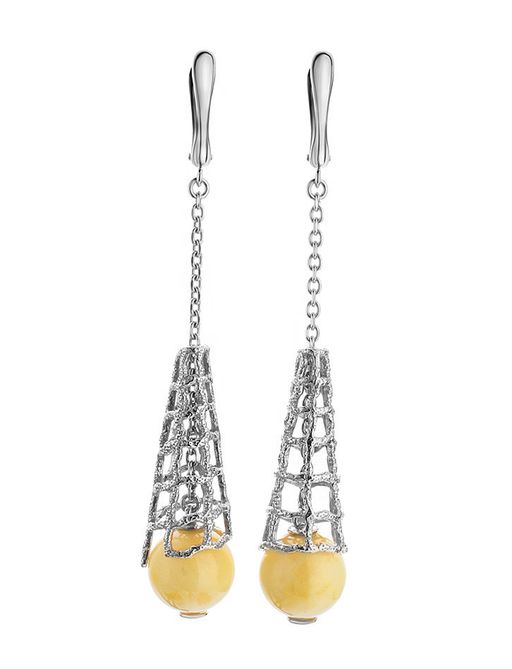 Необычные ажурные серьги из серебра и янтаря Паутинка
