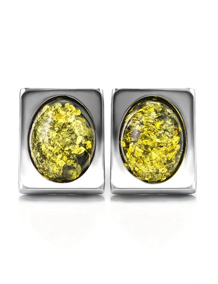 Стильные серьги Фиджи крупные из серебра с натуральным янтарём зелёного цвета