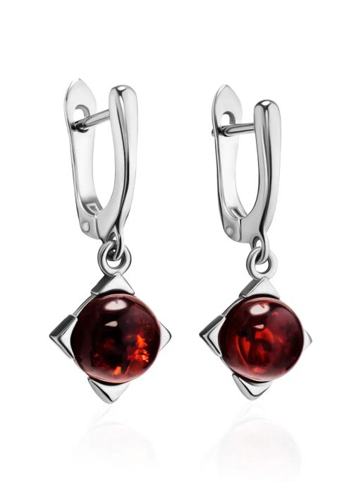 Яркие серьги из серебра и натурального балтийского янтаря вишнёвого цвета Рондо