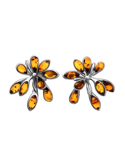 Крупные нарядные серьги из натурального коньячного янтаря в серебре Георгина