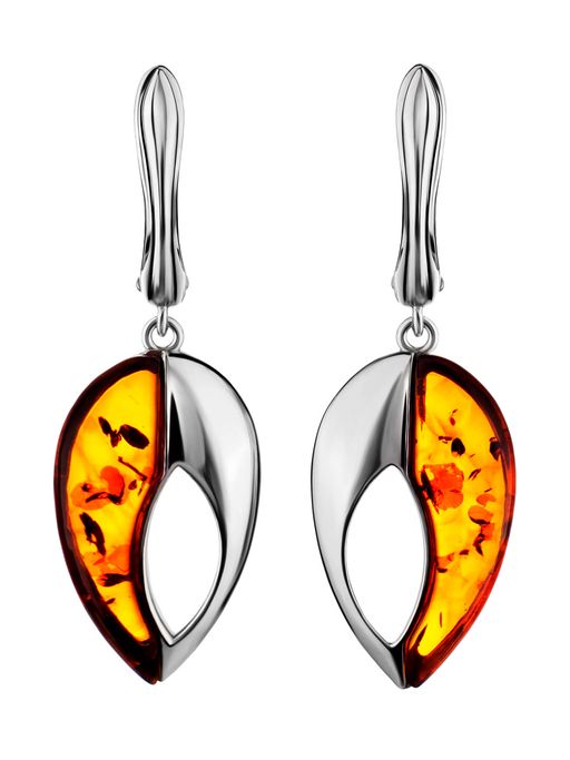 Оригинальные серебряные серьги с натуральным коньячным янтарём Санрайз