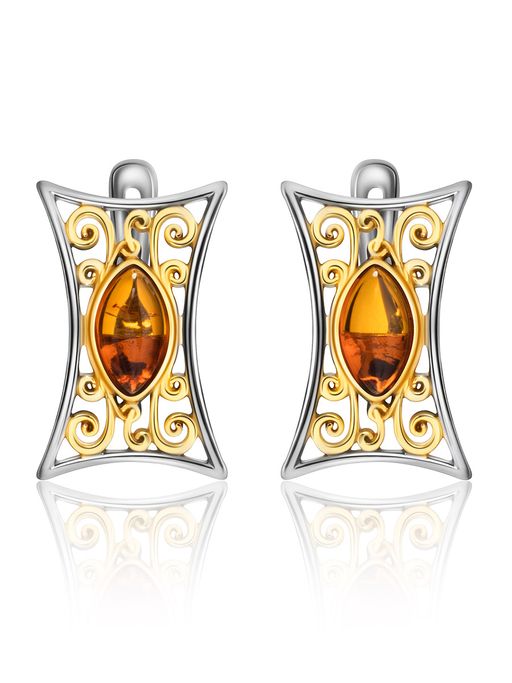 Красивые серьги из чернёного серебра и янтаря коньячного цвета Арабеска