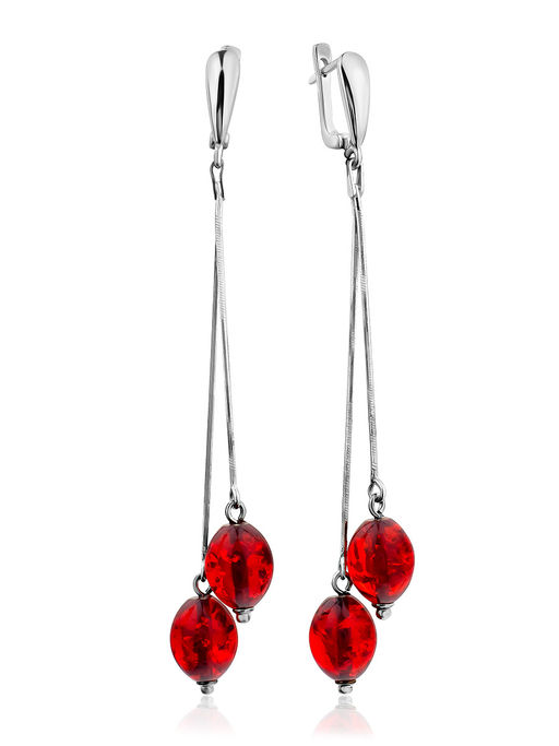Яркие длинные серьги с янтарём красного цвета Рябина