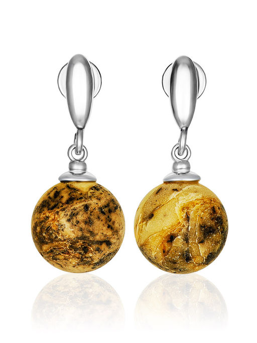 Серьги-гвоздики из натурального янтаря с сатиновой поверхностью Метеорит