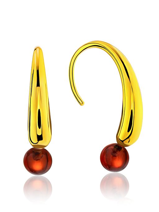 Оригинальные серьги-крючки Palazzo от ifamore из золоченого серебра с коньячным янтарём