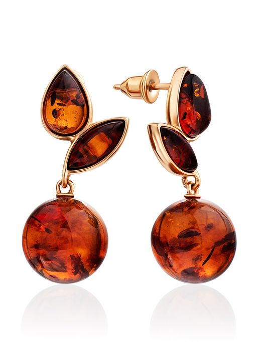 Яркие нарядные серьги из позолоченного серебра и коньячного янтаря Эдем