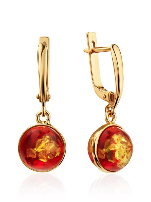 Яркие эффектные серьги из позолоченного серебра с искрящимся красным янтарём Сорбонна