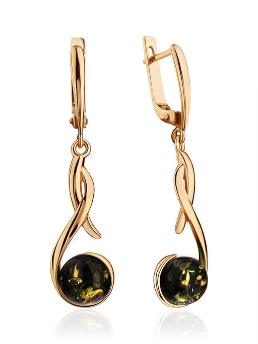 Изящные удлинённые серьги Феникс с зелёным янтарём