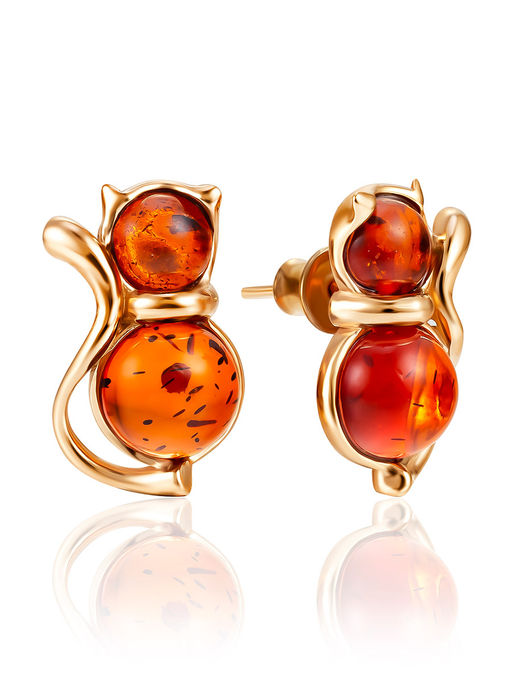Позолоченные серьги Кошечка с янтарём коньячного цвета