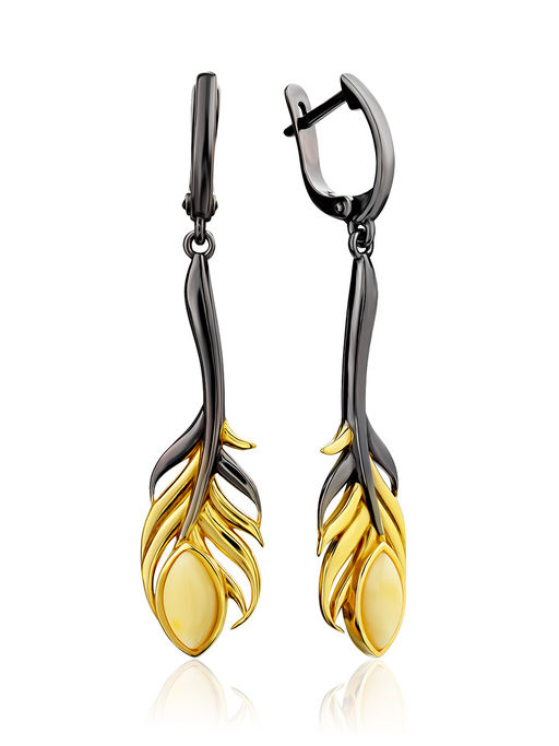 Нежные серьги с чернением и золочением, украшенные медовым янтарём Пёрышко