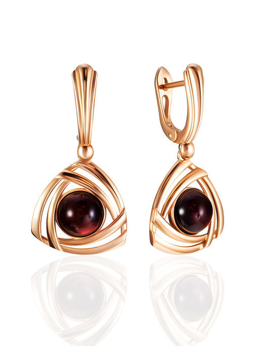 Серьги с треугольными подвесками Мистраль, украшенные вишнёвым янтарём