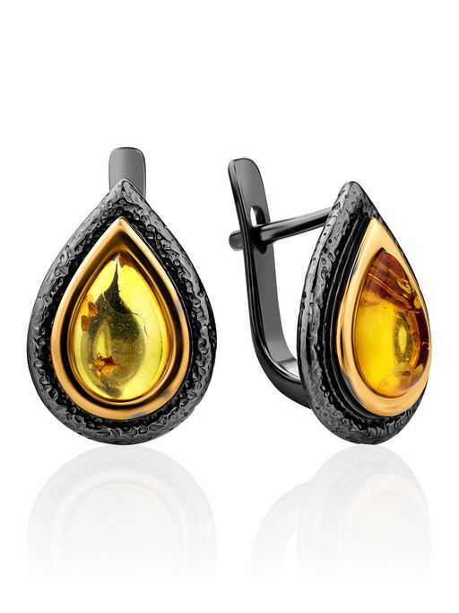 Небольшие стильные серьги с натуральным золотистым янтарём Змейка