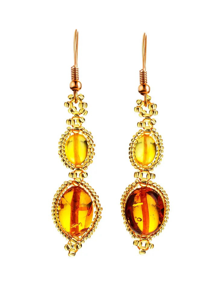 Плетёные серьги из натурального цельного янтаря и бисера Лукоморье