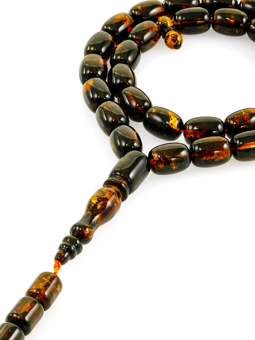 Чётки-бочонки из формованного янтаря с тёмно-зелёной текстурой