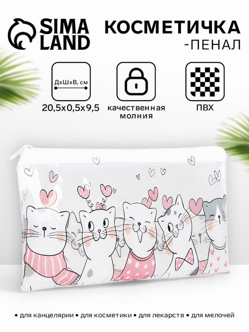 Косметичка-пенал на молнии, с рисунком Влюблённые коты, прозрачная/белая