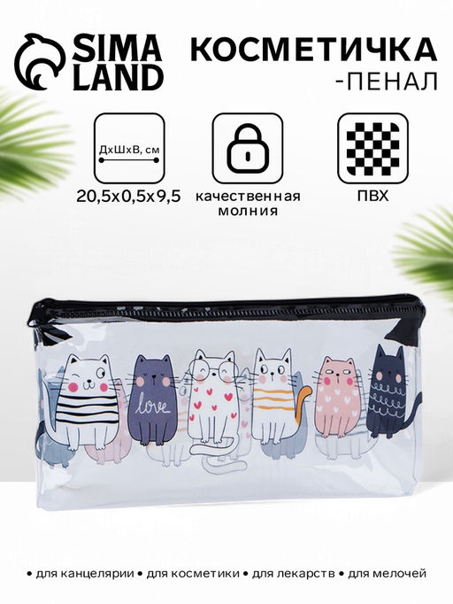 Косметичка-пенал на молнии, с рисунком Влюблённые коты, прозрачная/чёрная