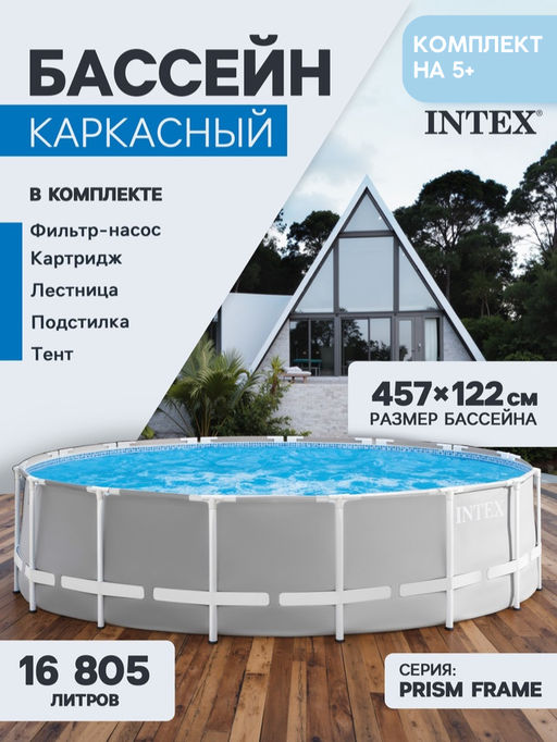 -22% Бассейн Prism Frame 457х122 см (фильтр-насос 3,8 м3/ч, лестница, подстилка, тент), INTEX