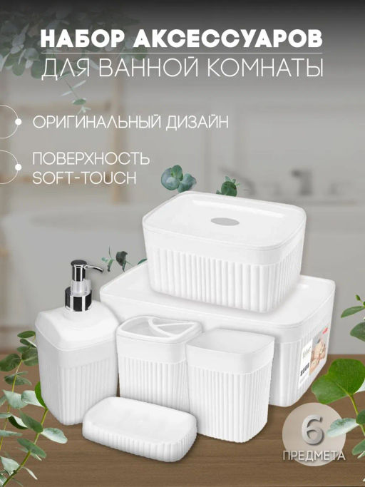 Набор: ЛОТОК С КРЫШКОЙ 6,55л+0,9л+Диспенс д/мыла+Стакан д/зуб.щет+Стакан+Мыльница "VELVET"(Белый)
