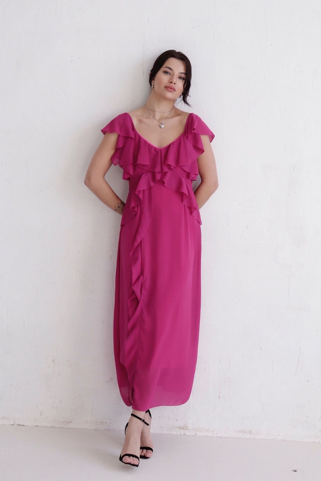 Платье с воланами малиновое