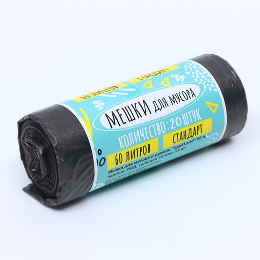 Цена за 2 шт. Мешки для мусора в рулоне UpakLand=60 л, черные, ПНД, толщина 15 мкм, 20 шт.