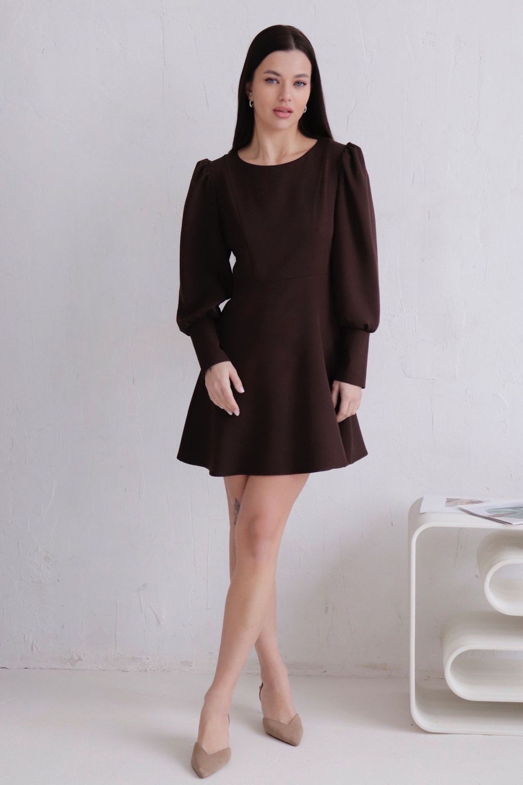 Платье с высокими манжетами тёмно-коричневое