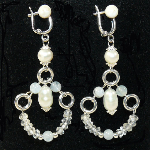 Серьги из аквамарина диаметр 5 мм, топаза диаметр 3 мм, жемчуга 6х10 мм - длина 6.5 см