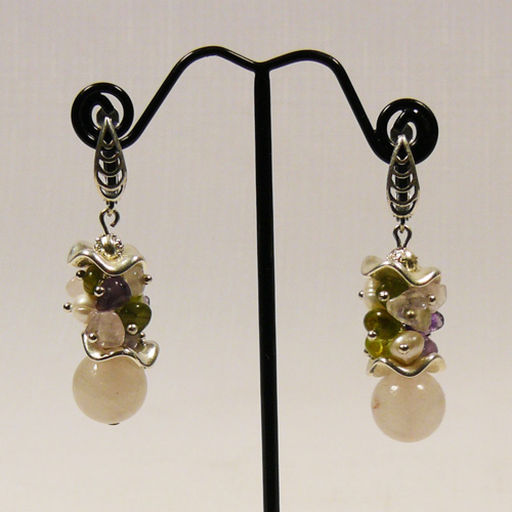 Серьги из розового кварца диаметр 12 мм, аметиста (галтовка), хризолита (галтовка), жемчуга диаметр 4 мм - длина 5.5 см