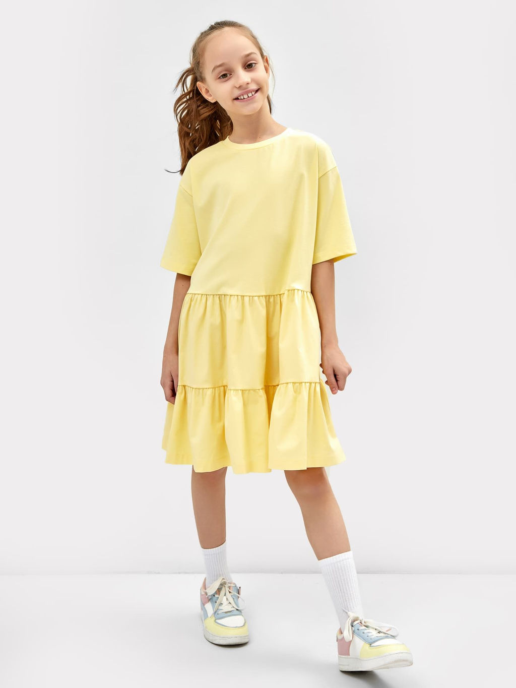 Многоярусное платье силуэта оверсайз для девочек светло-желтое