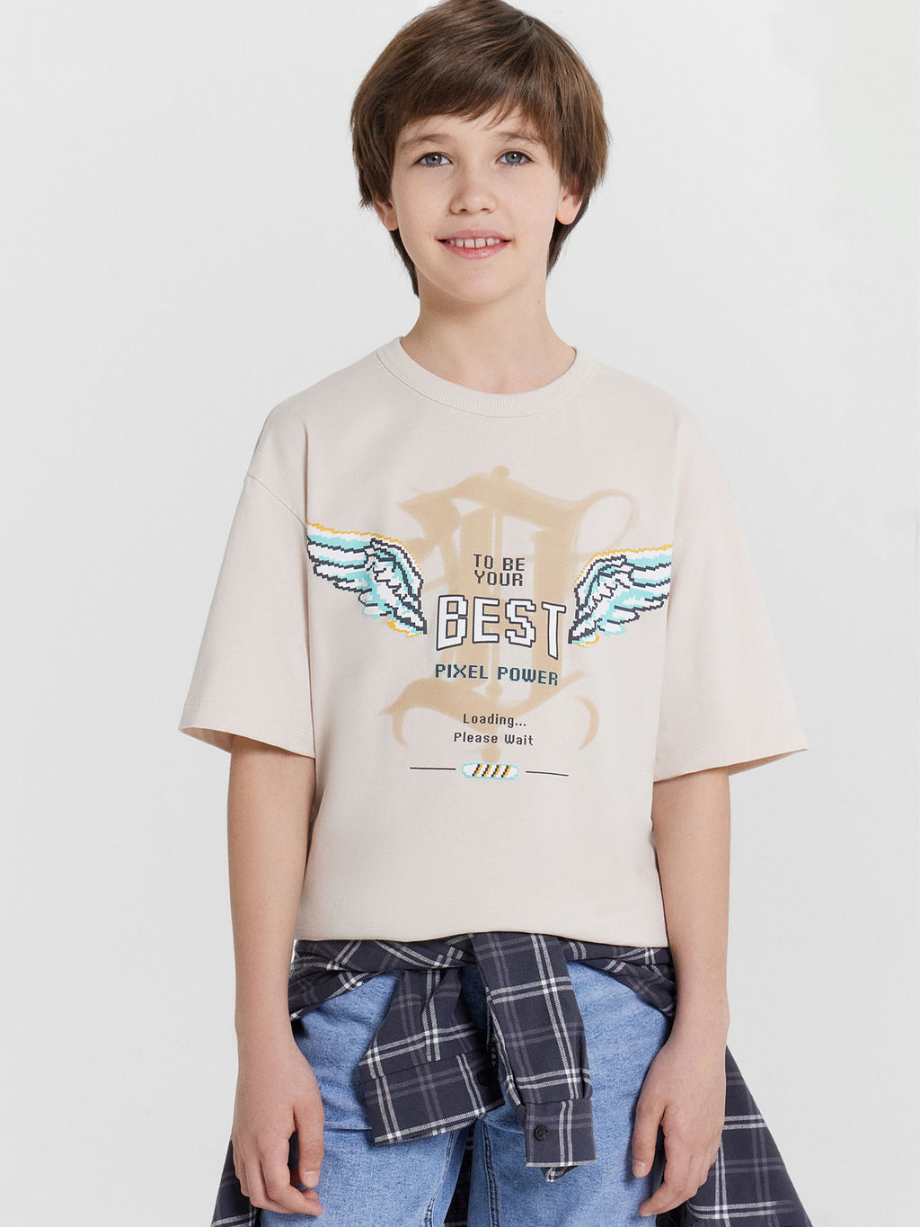 Футболка для мальчиков бежевая с принтом и надписью "best pixel power"