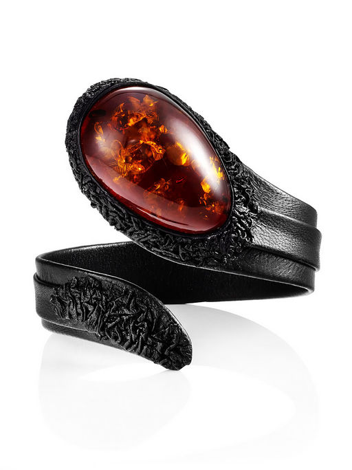 Браслет Змейка из кожи с вишнёвым янтарём