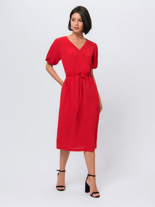 Платье красного цвета длины миди с пышными рукавами и глубоким вырезом
