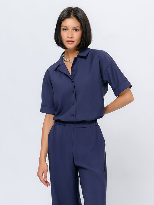 Блуза темно-синего цвета укороченная с короткими рукавами на пуговицах