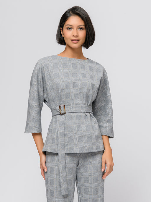 Блуза серого цвета в бежевую клетку с поясом и рукавами 3/4