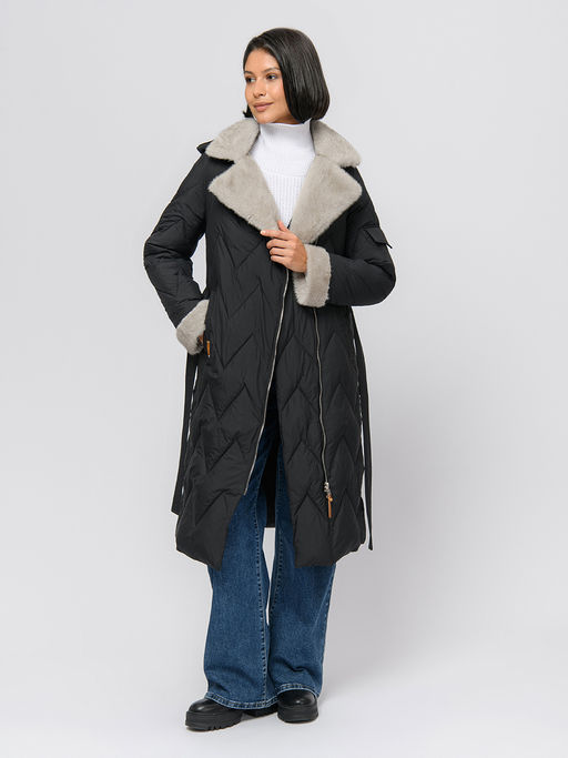 Пальто зимнее черного цвета с поясом и отложным воротником
