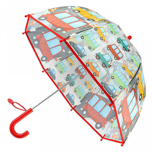 Зонт-трость механический "Детство" "Автомобили" POE (полиолефиновый эластомер), прозрачный с деколью, с окантовкой, 8 лучей, д/купола 70см, 68,5см в сложенном виде, именная табличка, пластмассовая ручка, цвет красный, 235гр (Китай)