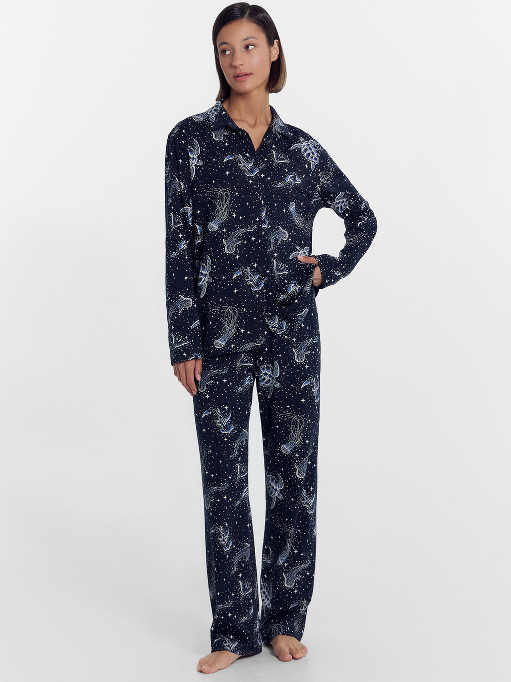 Комплект женский (блузка, брюки) синий со звездным морем