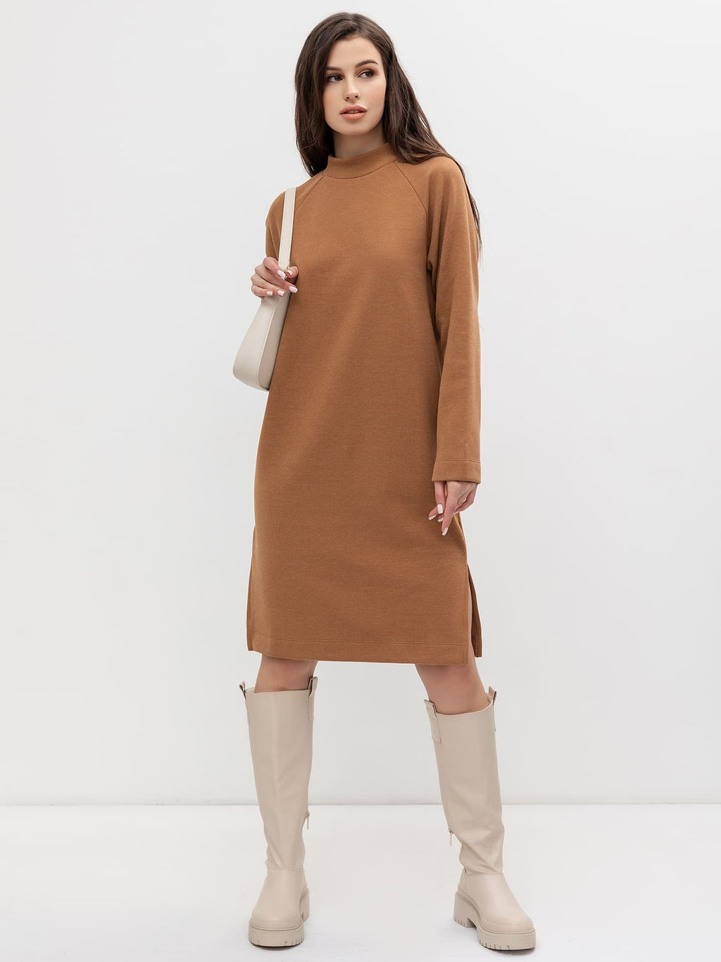 Платье из селаника с длинным рукавом в коричневом цвете