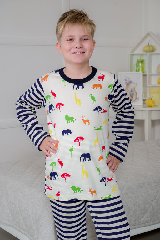 Пижама детская из джемпера и брюк без манжет из интерлока Сафари темно-синий полоса