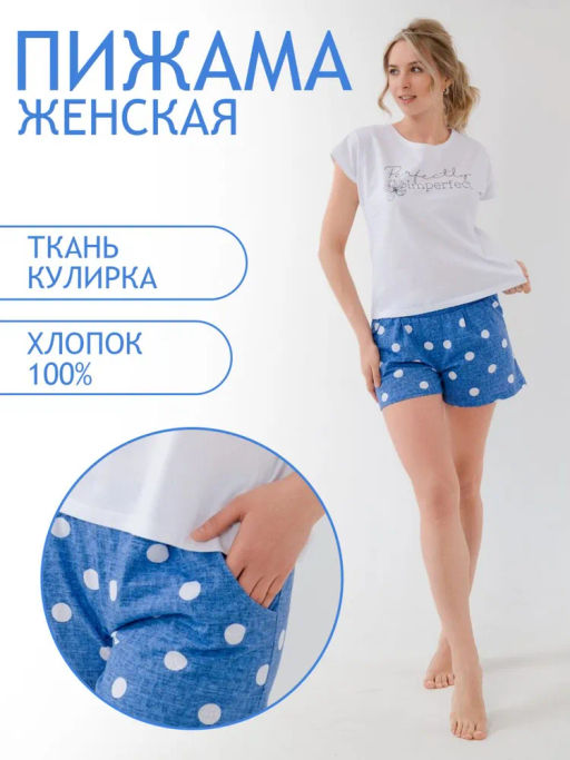 Пижама женская из футболки и шорт из кулирки Алиса горох синий