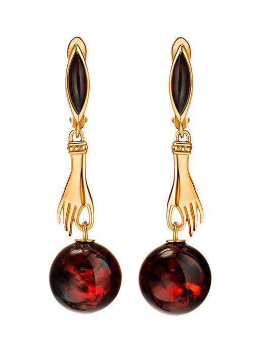 Удлинённые серьги Объятия с натуральным тёмно-коньячным янтарём