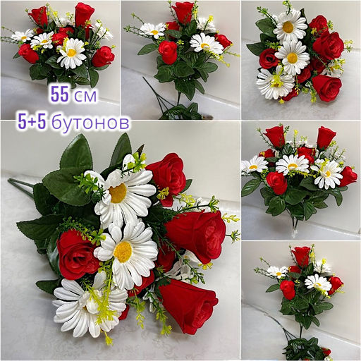 Цветы розы+ромашки букет 55см, бутонов 5/5