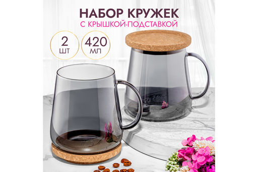 Набор 2 кружек 420 мл 11,5*9*10,5 см "Crystal glass" + пробковая крышка-подставка, серый