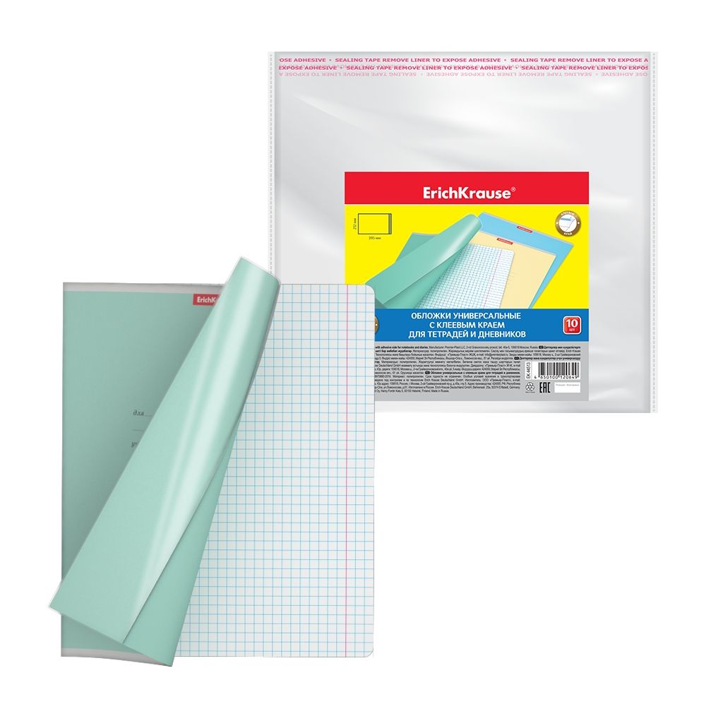 Цена за 1 шт. Набор пластиковых обложек ErichKrause Fizzy Clear, для тетрадей и дневников, с клеевым краем, 212х395мм, 50 мкм (пакет 10 шт.)