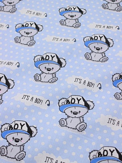 Поплин "Мишутки-мальчишки на голубом в белый горох", СОРТ2, ш.1.5м, хлопок-100%, 115гр/м.кв