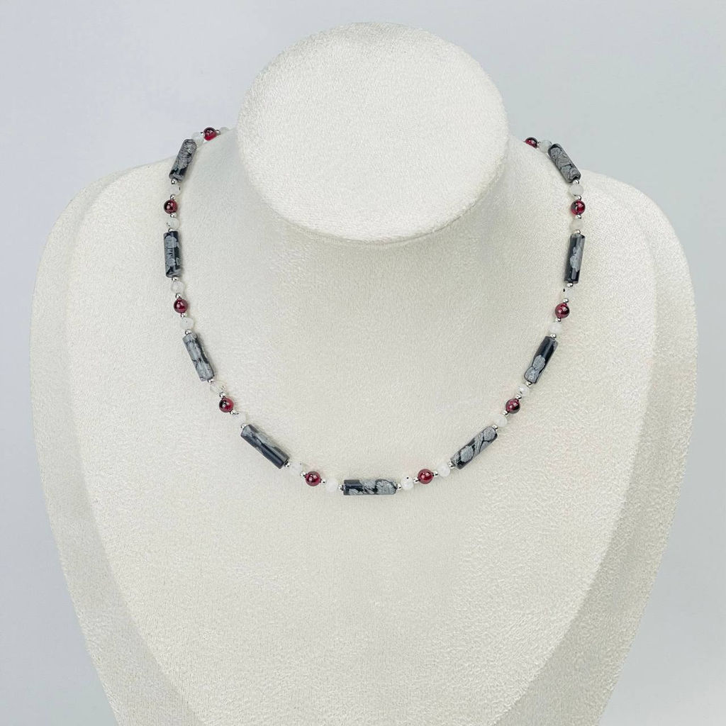Колье из снежного Обсидиана, Граната и Лунного камня