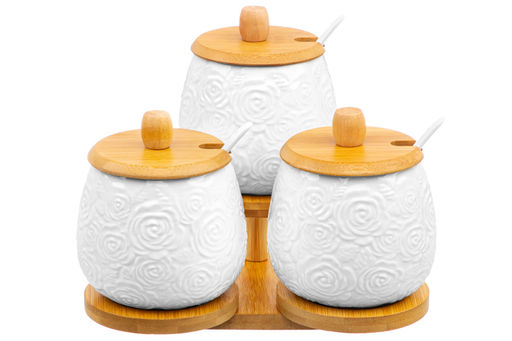Набор 3 банок д/хранения 400 мл 21*19*17 см "Розы" на дер. подставке + ложки