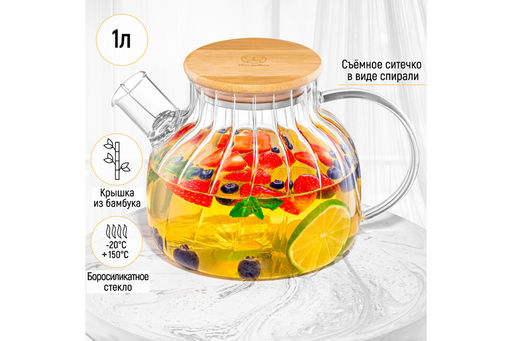Чайник 1 л 20*14*13 см "Crystal glass" с ситом+бамб.крышк.с метал. дном/с силик.уплотнит, стекло