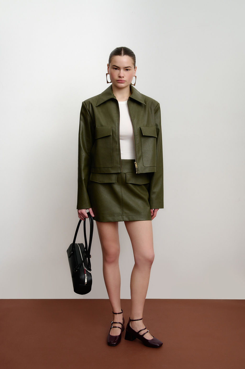 Куртка укороченная из экокожи с накладными карманами