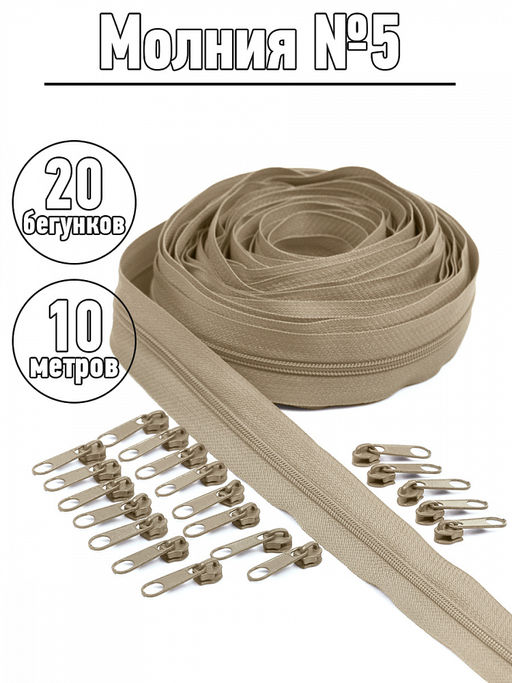 Набор молния Mzip рулонная 10м, бегунки 20шт для спирали №5 цв.F308 бежевый